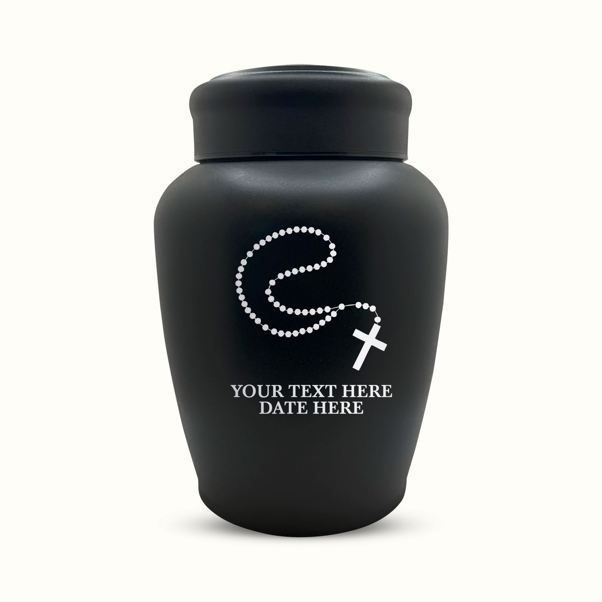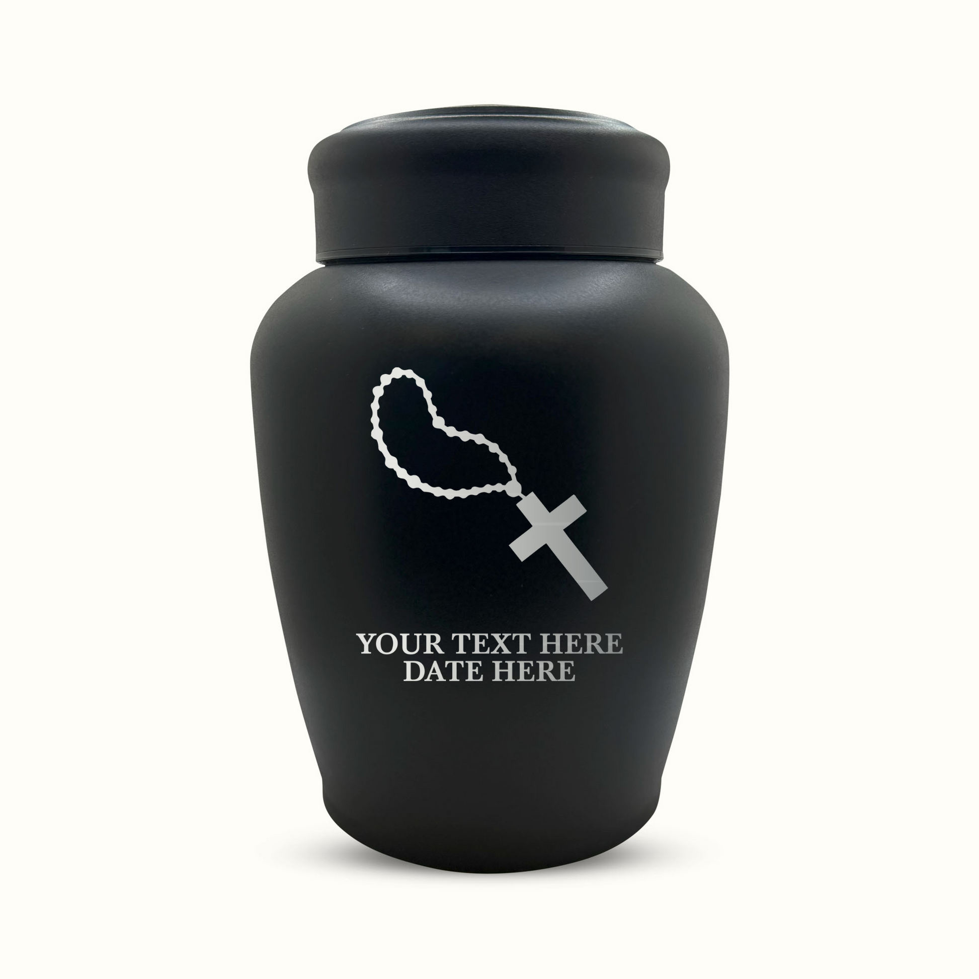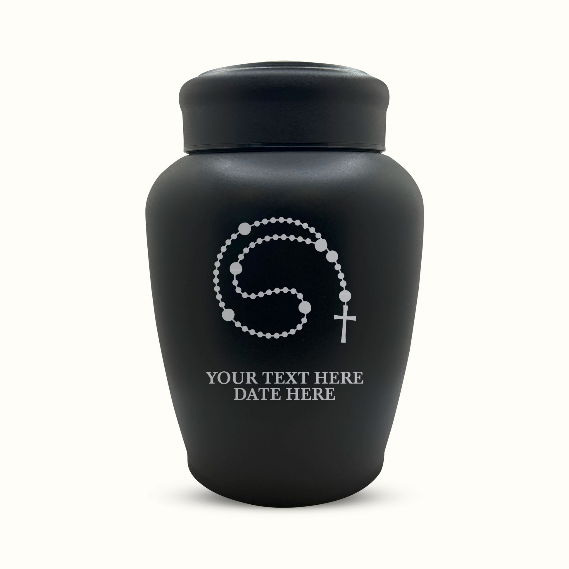 Classic Black Powder Coated Stainless Steel Human Cremation Urn – 150 Cubic Inch | Rosary Memorial