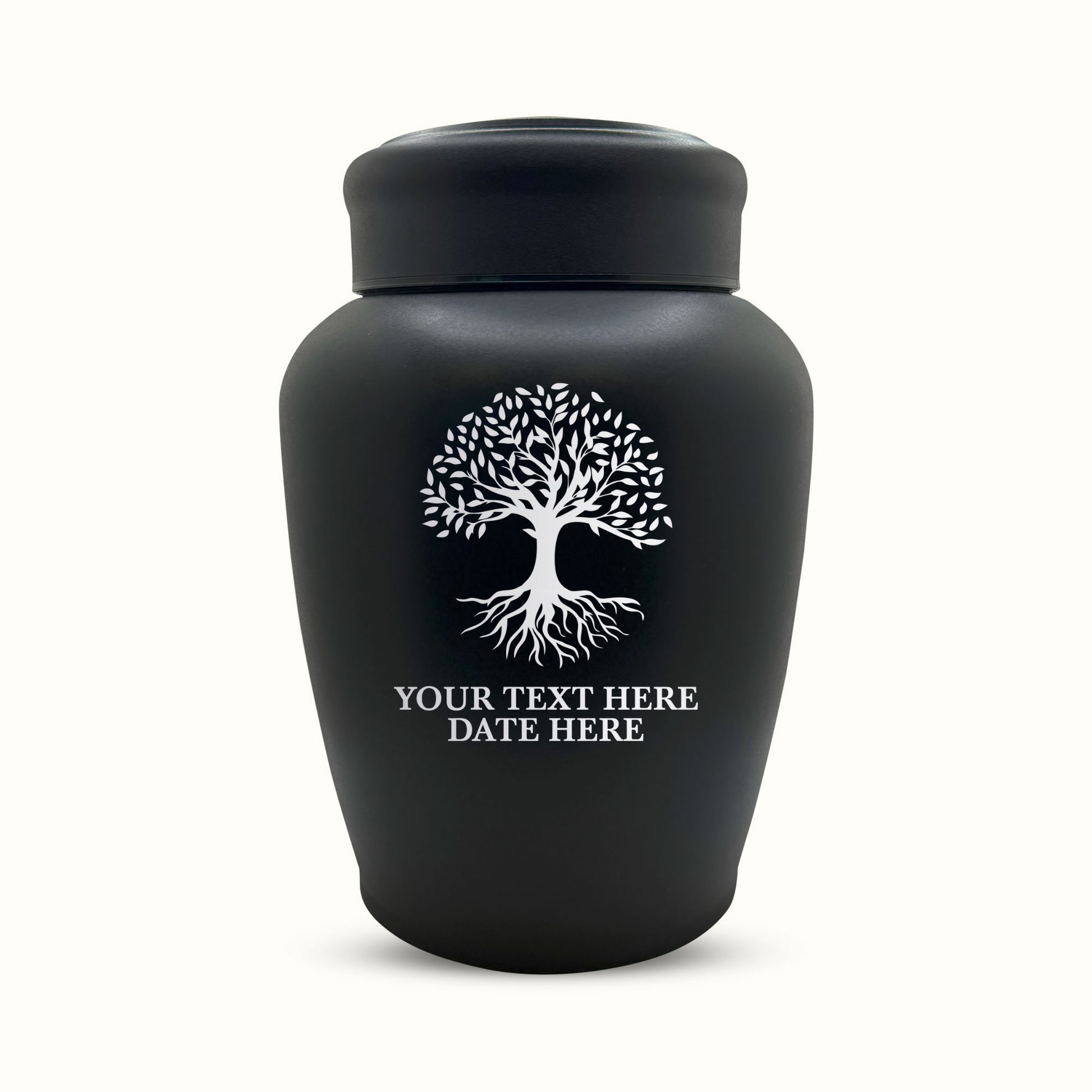 Classic Black Powder Coated Stainless Steel Human Cremation Urn – 150 Cubic Inch | Tree of Life